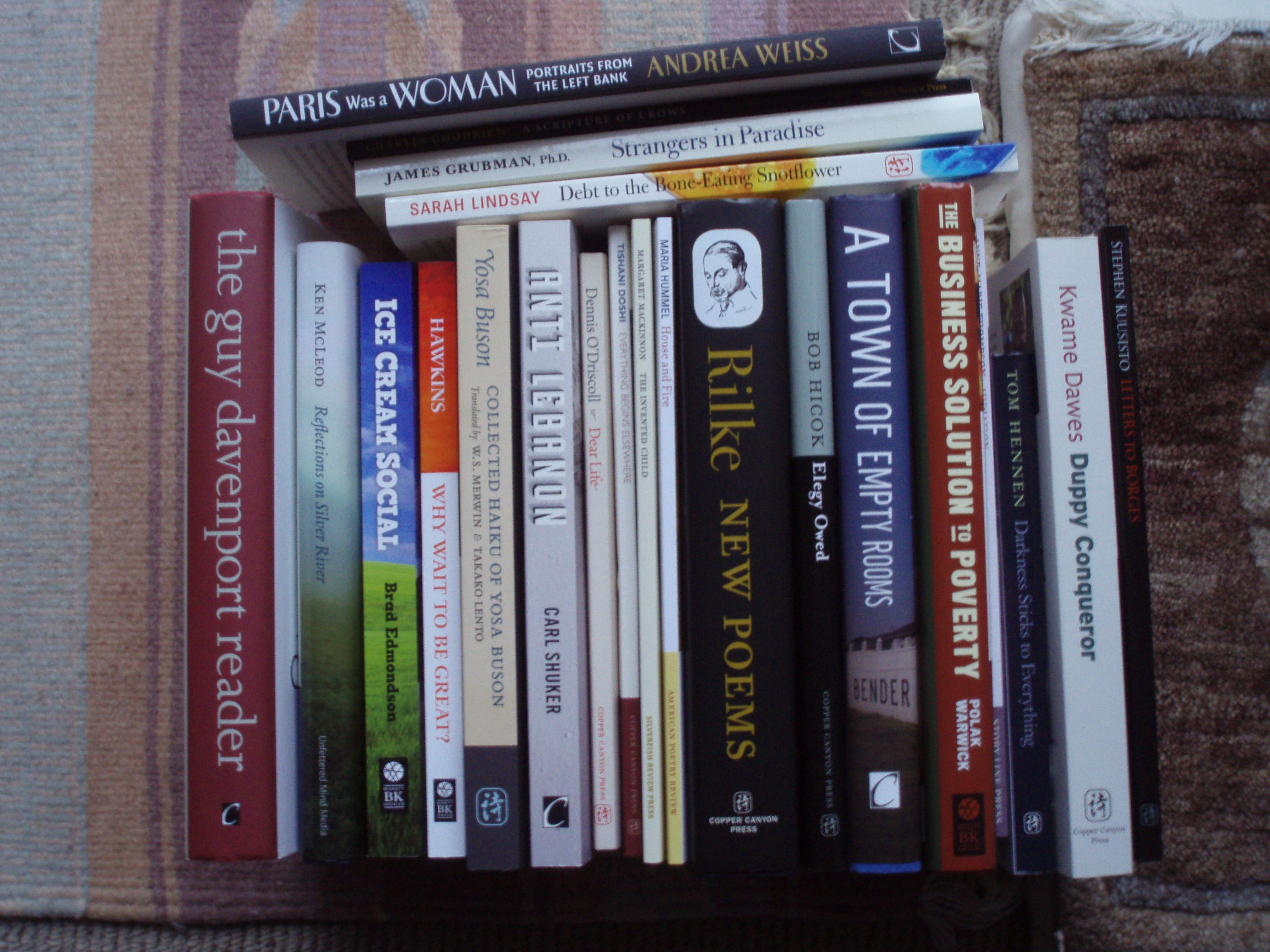This “shelfie” includes titles from Copper Canyon Press, Counterpoint, Berrett-Koehler, Westchester State University, American Poetry Review, Silverfish Review Press, FamilyWealth Consulting, and Unfettered Mind Media.
